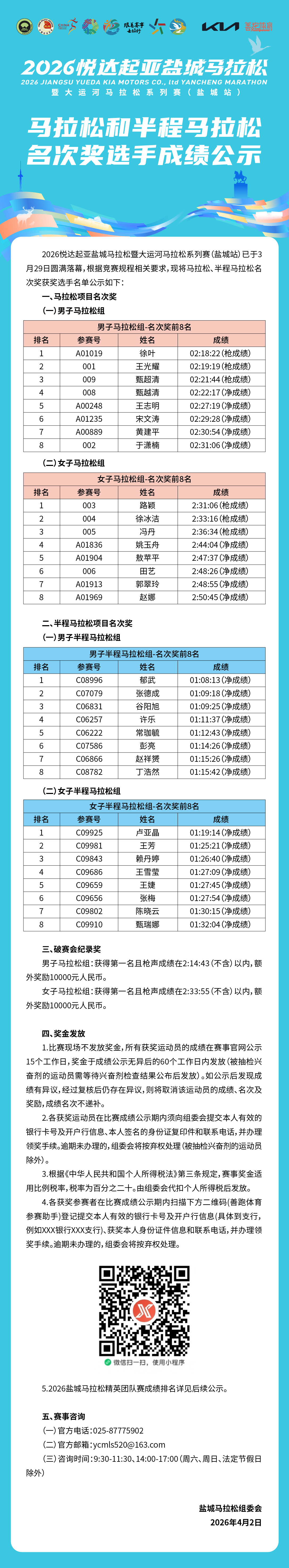马拉松和半程马拉松名次奖选手成绩公示